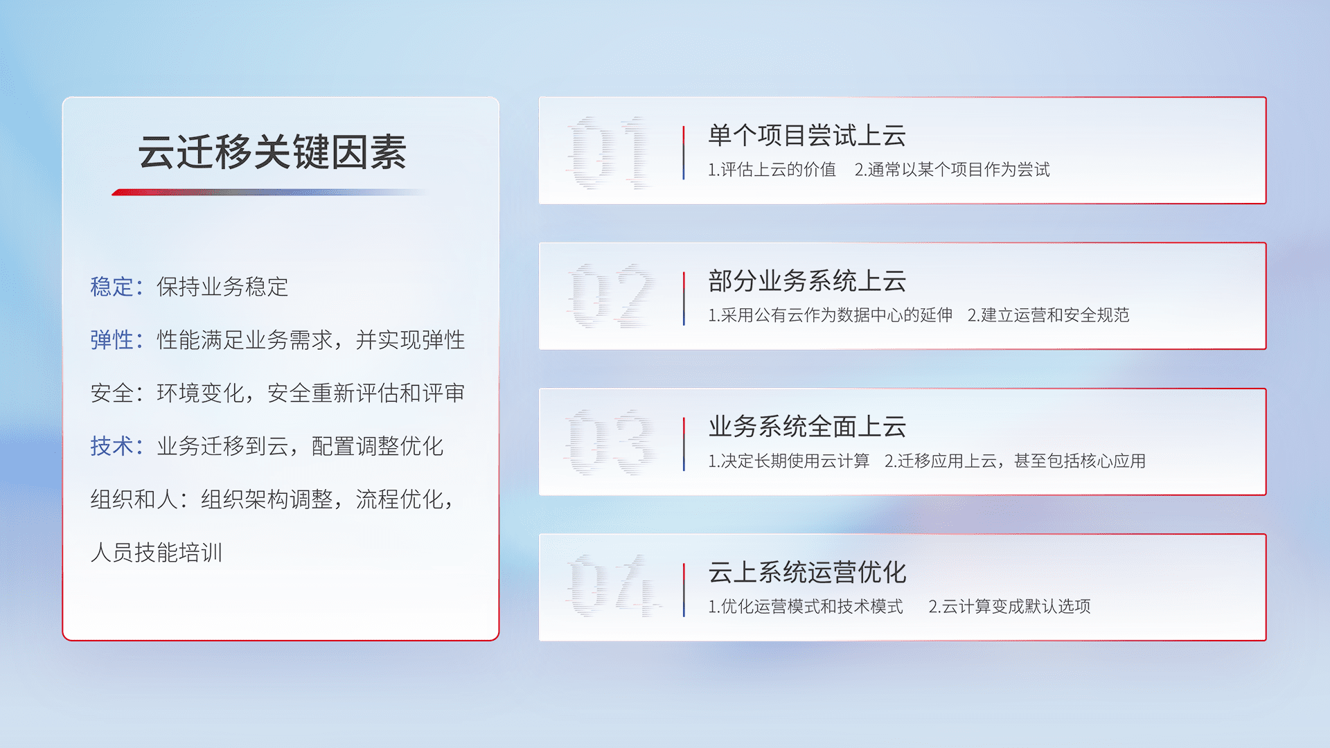 结合实际业务,,,,从规划设计、、、、云平台选型、、、云原生改造、、、、数据迁移、、集成交付,,,迁移全过程为客户识别最佳上云路径,,,,做好风险识别管理,,设计网络架构、、身份权限、、安全审计合规、、、操作审计、、、日志审计、、、、监控告警策略、、、、多站点容灾设计等,,对云上基础设施进行整体规划,,提升IT治理水平,,,以满足弹性、、、、高可用、、、、高性能的需求。。。。
